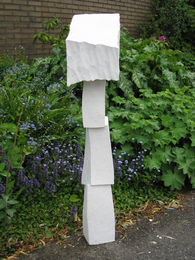 Dit beeld is gemaakt uit een grote sokkel van 1 meter bij 30 bij 30 centimeter. Er liggen er nog 2 op hun bestemming te wachten en het ligt in de bedoeling om een groep van 3 te maken. te maken. De kleur van de steen associeerde ik meteen paddenstoelen.